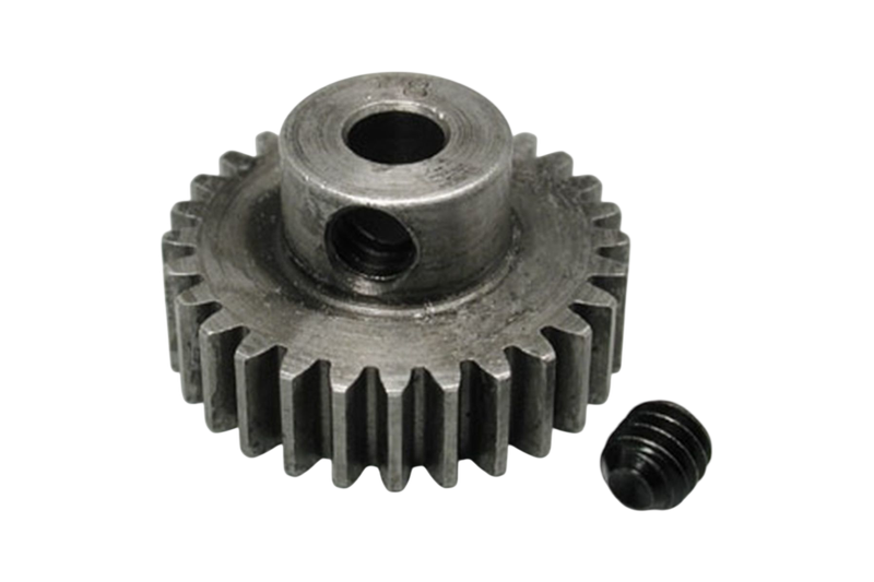 Super hard, heat treated, "Absolute" pinion gears are a must for using with our steel spur gears and will last and last if used with plastic spur gears. In sizes 9 through 23 teeth. All pinions stamped with tooth number. 1/8 inch bore. One 5-40 set screw included. 1/16 inch allen wrench (NOT INCLUDED) fits the 5/40 set screw.