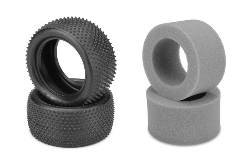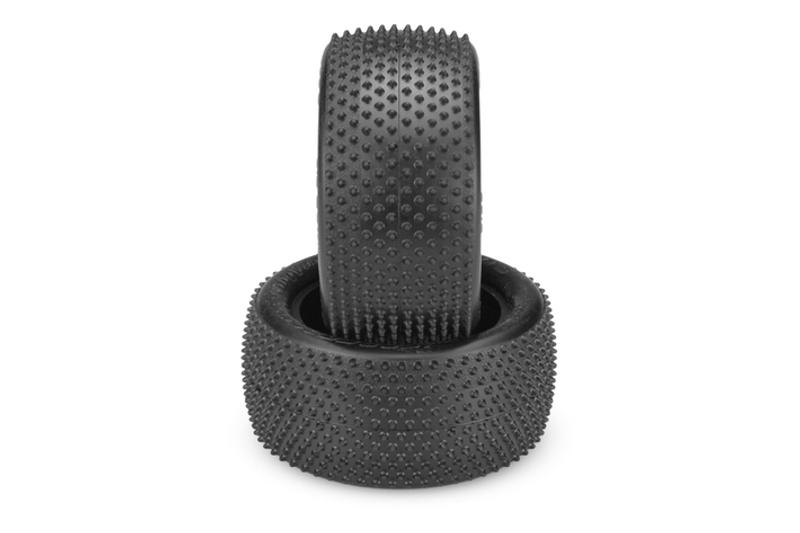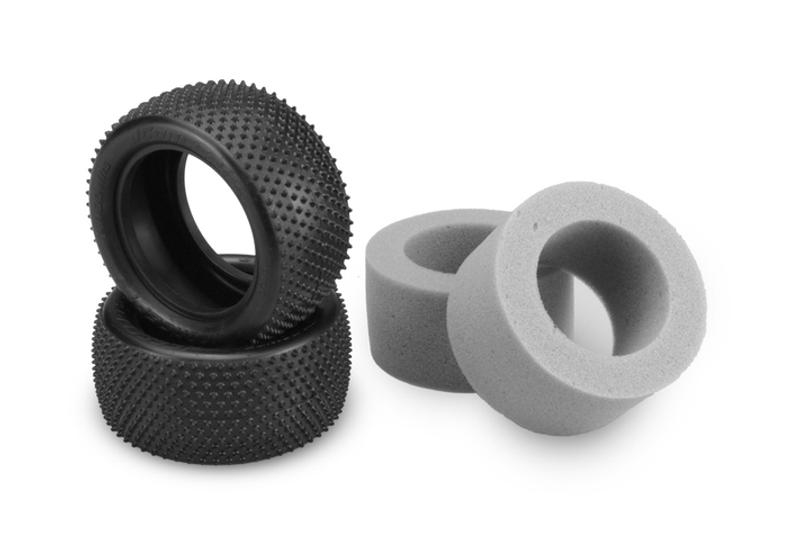 The tire carcass itself has been refined to reduce weight while maintaining strong sidewall support. The pink compound marked with 2 pink dots on the tire represents a new compound for JConcepts, a medium soft material with good wear characteristics. The rear tires include gray, open cell inserts making them a complete set ready to mount, straight out of the package. The Pin Downs work best on Carpet and Astroturf tracks where typically a small pin tire is working.