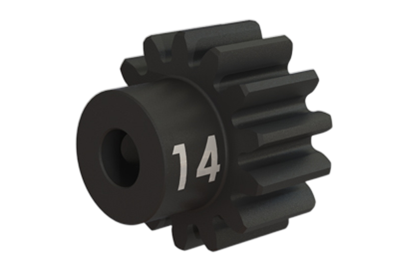 Gear, 14-T pinion (32-p), heavy duty (machined, hardened steel) (fits 3mm shaft)/ set screwThe heavy-duty 14-tooth (32-pitch) pinion gear is machined from hardened steel for extra-long life. The gear fits 3 mm motor shafts and includes set screw. Traxxas pinion gears let you fine-tune the performance of your Traxxas model. Changing gear ratios can help balance acceleration and top speed for different running conditions. Please consult your owner’s manual for more information on recommended gearing options for your specific model.